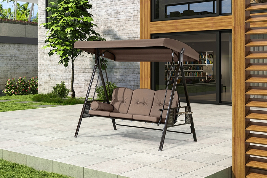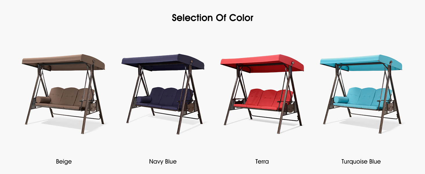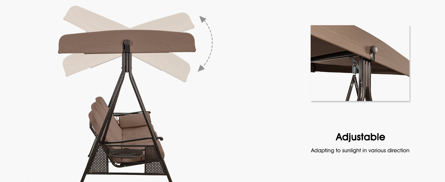 The canopy of this porch swing can be rotated. provides optional shade coverage for sunshade all day long. Three wide removable seats give you plenty of space. Soft cushion makes it more comfortable for your back or arm in a relaxing break. 2 foldable multifunctional side tables included.