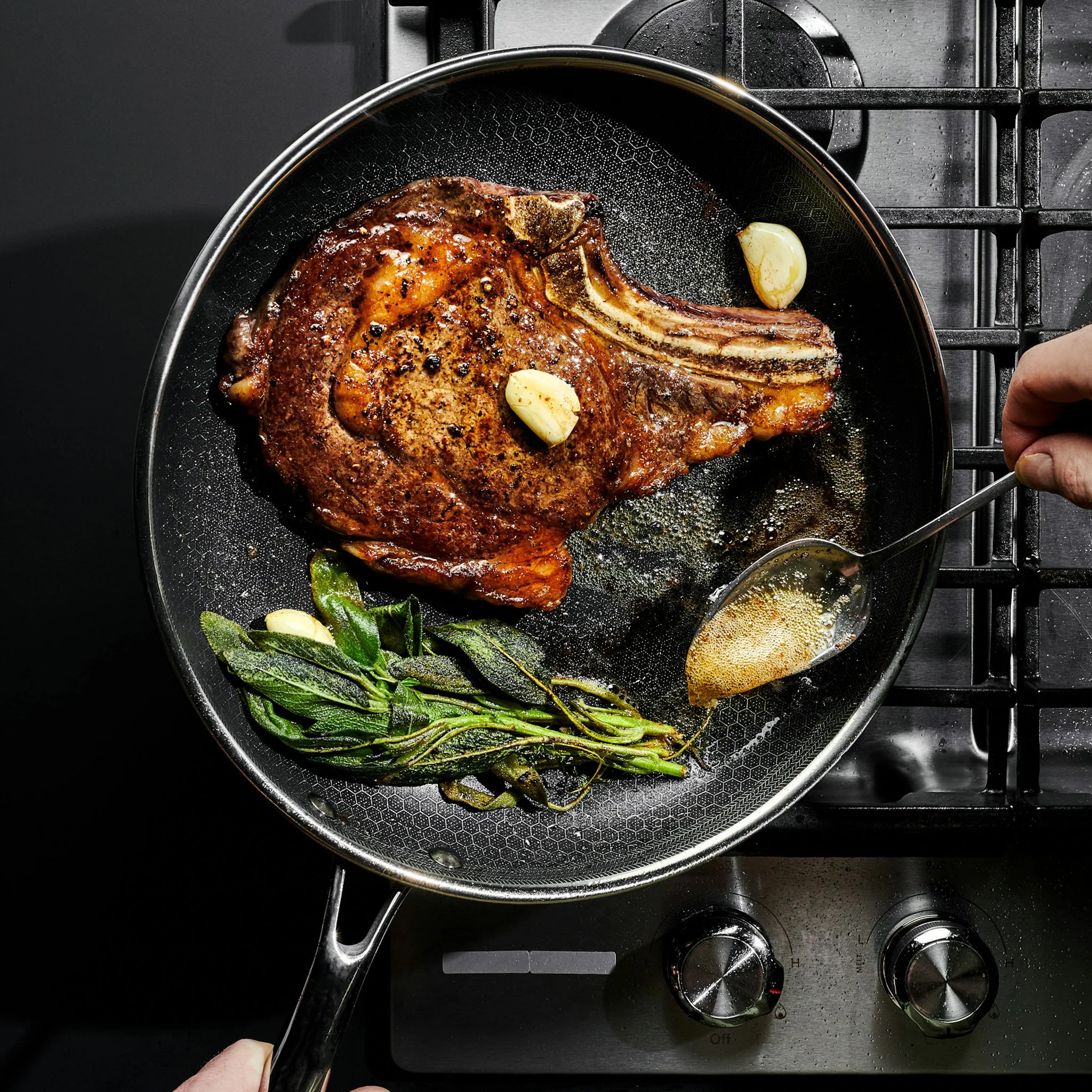 HexClad distributes heat swiftly. Start on lower temperatures; medium with HexClad equals medium-high with others.