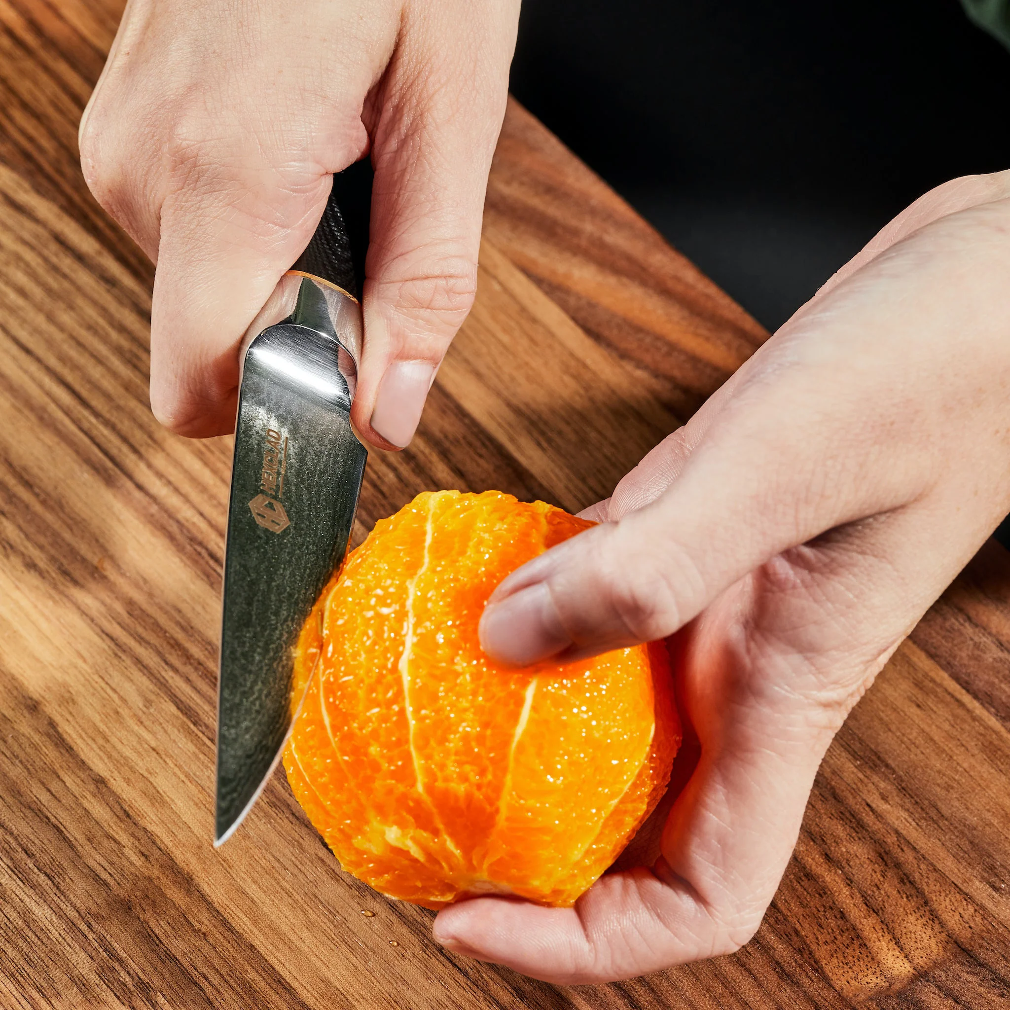 If there’s one thing that signifies the leap from “good cook" to “knockout cook," it’s a spectacular knife set. Our limited edition Master Series Damascus knives are the “black-tie” of knives. Think: modern, full hybrid tang and ebony in hue with a hint of gold detailing. They comprise 67 layers of Damascus steel, a prized, exceptionally hard material from the pre-industrial era once used to make weapons. With their super-sharp blades (a sharp knife is a safe knife!), these knives stay sharper longer. This extraordinary set is as much a conversation piece as a culinary necessity.